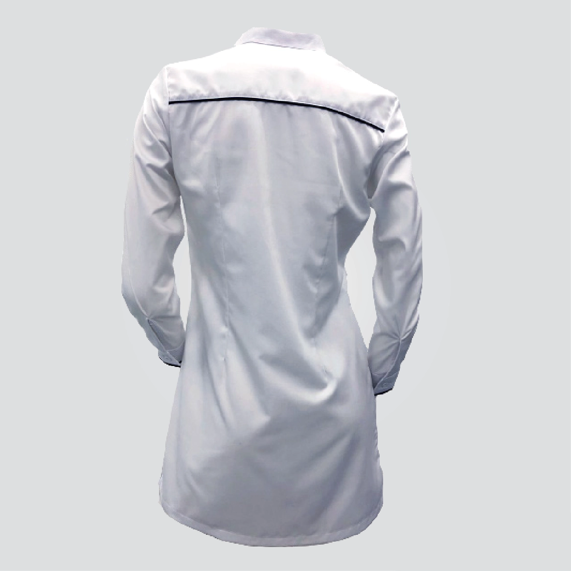 We use a premium poly-cotton blend to give you the breathability of natural cotton combined with the durability and wrinkle-resistance of high-grade polyester. The clean white fabric is accented by a sharp navy blue vertical piping and matching cuff details, creating a distinctive look for your corporate team.